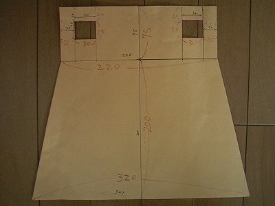 新聞紙の型紙を採寸し、切りの良い寸法に置き換えて模造紙で型紙を作り直しました。 |