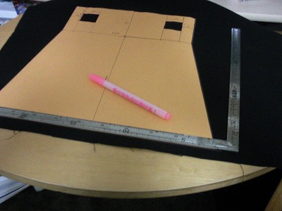 帆布のうえに型紙をあててケガキをします。 下側以外は、折しろを付けて切断します。 |