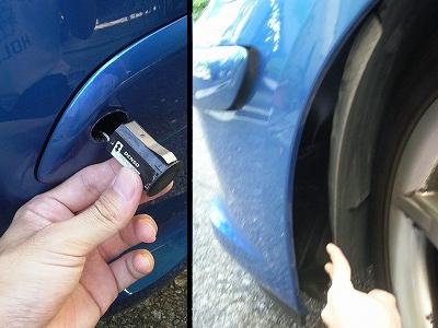 センサーはバンパーのモールに差し込んであるだけなので、ツメやマイナスドライバーを間に入れてこぜると簡単に外れます。 配線はギボシで接続されていたので、そこからセンサーだけを外しました。 配線を外す際はタイヤハウスのカバーを外して、そこから手を入れると良いでしょう。 タイヤが内側になるようハンドルを切り、上下2ヶ所のクリップを外せば手が入る隙間をつくることが出来ます。 配線は白/黒の2本で、極性があるようです。 |
