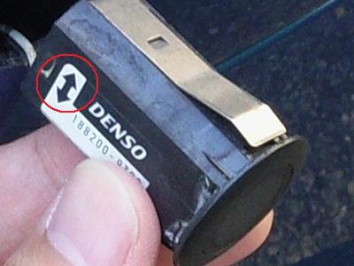 センサーの側面に、矢印のマークがあります。 この矢印は車に対して上下方向になるように取り付けられています。 復元する際は、この方向に注意しましょう。 向きを間違えると、センサーの指向性が変わってしまいます。 |