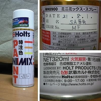 ボディー同色塗装は、缶スプレーを使いました。 HoltsのMINI MIXというカラー調色システムで作ってもらったものです。 カー用品店でMINI MIXの調色機があるところであれば、その場で作ってもらえます。 プジョーの塗装色をオーダする場合は、車体に表示されたカラーコードではなく、日本国内用に登録されたカラーコードでのオーダが必要となります。 カラーコードが分からない場合は、プジョーディーラに問い合わせると良いでしょう。 また、HoltsのMINI MIXのサイトでは、登録された塗装色が検索できますが、プジョーの塗装色を検索しても非対応と出てくることがあります。 その為、調色機がある店舗でも、このシステムに慣れていない店員からは、非対応だと断られることがあります。 サイトで非対応でも、調色機には調色情報が登録されている場合がありますので、断られても調色機で直接調べてもらうよう交渉しましょう。 私がオーダしたエーゲーブルーも、サイトでは非対応となりますが、「3F」または「MF」というカラーコードで調色機に登録されていました。 <参考> プジョーの塗装色については「取説にない取説」のページにもう少し詳しく記載しております。 |