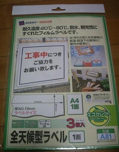 使用したのは全天候型ラベルというレーザープリンター用のものです。ホームセンターで500円前後で売られています。 コンビニのプリンターを使って、これに好きな画像を印刷をするという作戦です。 コンビニのプリンターで用紙が手差しできるところを探しましたが、どこも手差しはNGでした。 唯一セブンイレブンだけが、コピーメニューでハガキに印刷ができ、そのハガキは手差しで使えます。 (2012年4月時点の情報) そこで、全天候型ラベルをハガキサイズにカットして、それをハガキの代わりに手差しすることにしました。 |
