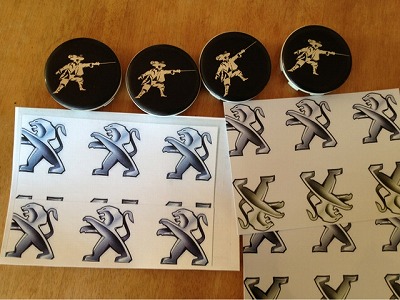 画像データがハガキサイズであった為、サービスサイズにすると周囲が切れてしまい、絵柄も切れてしまいました。 その場でなんとかしたかったので、画像データを作り直さず、サービスサイズを2枚作り、それを重ねて強引にハガキサイズに4つの絵柄を入れました。 そうして出来たラベルが一番左のシートです。 上に並べたものが社外品ホイールのセンターキャップで、絵柄はこの円の中に入るサイズで作りました。 |