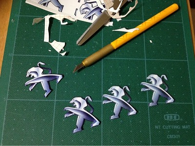 ラベルになった絵柄をハサミとアートナイフで切断します。 絵柄だけを残し、背景部分は切り落としました。 センターキャップの表面が湾曲しているので、延びないラベルの一枚張りは出来ません。 |