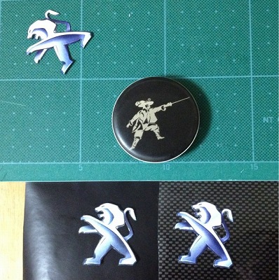 センターキャップのベース色は、カーボン柄やシルバー等、色々迷いましたが、最終的に無地の黒にしました。 黒のカッティングシートをセンターキャップに貼り、その上にラベルで作った絵柄を貼ります。 その上からコーティングになるものを吹き付けると良いと思いますが、ラベルの耐久性を試したいのでそのままにしています。 クリアーなどを吹く場合は、印刷を溶かさないものを選ぶ必要があります。 |