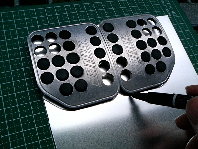 アダプター板に純正ペダルの穴をケガキしているところです。裏側からマジックでケガキしました。 この時、先にあけておいたアルミペダル用の穴に、ネジを入れておくと穴位置のずれが少なくなります。 |