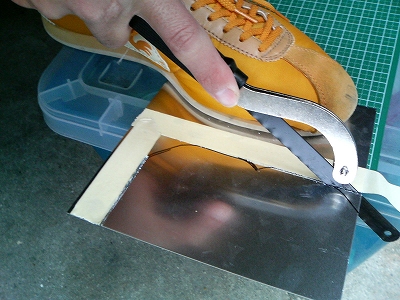 外形が決まったら、金ノコで切断します。 アルミ板はやわらかい素材なので、簡単に切断できます。 私は手元にあった道具を使いましたが、できれば台もノコもきちんとしたものを使いたいですね。 フランス車のDIYなので、靴はルコックを履きました。 作業とは何の関連もありませんね。スミマセン。 |