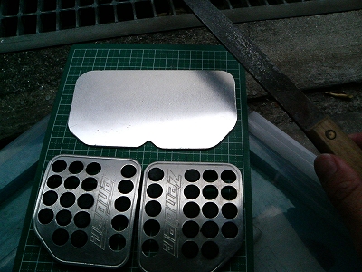 アルミ板の上にクラッチ用とブレーキ用のアルミペダルを並べて型取りをします。 アダプター板の外形は、アルミペダルよりも一回り小さく作ります。 |