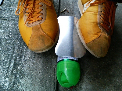 純正ペダルもアルミペダルも湾曲した形状なので、アダプター板も湾曲させましょう。 原始的な方法ですが、スプレー缶に押し当てて湾曲させます。 ちなみにスプレー缶はスキンガードです。 これも作業とは何の関連もありませんね。スミマセン。 |