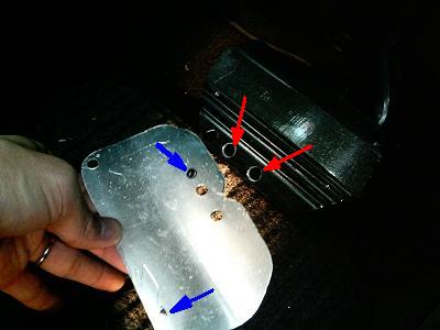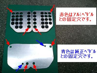 アダプタ板にアルミペダルを重ねて取り付け穴をケガキし、穴を開けます。 写真は穴あけ加工が完了したアダプター板です。仕上げが悪いのは気にしないでください。どうせ見えなくなる板なので手抜きです(苦)。 アダプター板とアルミペダルは、赤色矢印の穴で固定します。アダプター板には6mmの穴をあけました。 アルミペダル用の穴があいたら、次に青色矢印の穴を加工します。これは純正ペダルとの固定穴で、4mmの穴をあけました。 この穴については、次項で説明します。 |
