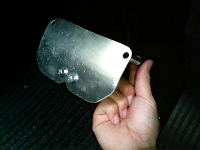 まずはブレーキペダルへの取り付けです。クラッチ用とブレーキ用の2枚アルミペダルを並べて取り付けます。 純正のブレーキペダルにM6用の穴が直接あけられないので、アルミペダルとの間にアダプター板をはさんで取り付けることにしました。 アダプター板の製作には、ホームセンターで購入した1mm厚のアルミ板を使用しました。 |