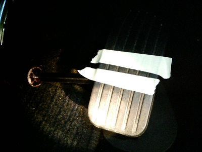 次はアクセルペダルです。 純正ペダルは樹脂でできており、厚みを持った形状をしています。 ペダルの左横からドライバーなどを差し込み、部分的に板状になっている部分をさぐります。 写真でマスキングしている辺りが板状(裏が空洞)になっている部分です。 この部分にタッピングビスでアルミペダルを固定することにしました。 純正ペダルの上に、アルミペダルを両面テープで固定します。その状態で、タッピングビスの下穴をあけます。 タッピングビスは、頭がアルミペダルの穴より少し大きいものを2つ使用して固定しました。 さらに、万が一の際の回り止めとして、アルミペダルの穴よりもわずかに小さいタッピングビスを、穴の中に沈めてねじ込みました。 |