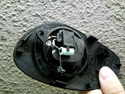 写真は純正のツイータです。網のような部分の裏についていました。コンデンサーが半田付けされており、コレがハイパスフィルターの役割をしているのでしょう。