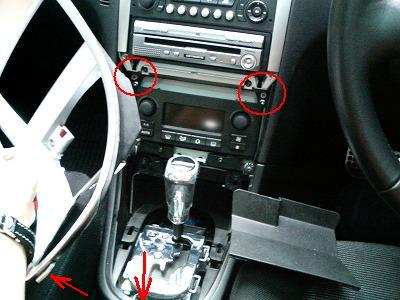 はじめにインパネのシルバーの枠を外します。灰皿を外したところにネジが2本あります。